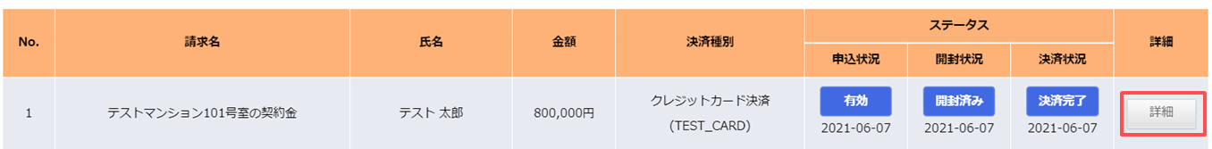 ①都度決済→請求管理→対象者の「詳細」ボタンをクリックください。